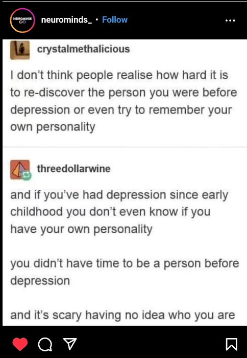 In the workbook, the first exercise was to figure out where my priorities lie. My #1 priority, turns out, is connection. But to think deeply on this, connection with myself. I have had depression since highschool, and recently saw a this post pop up in my Instagram feed.