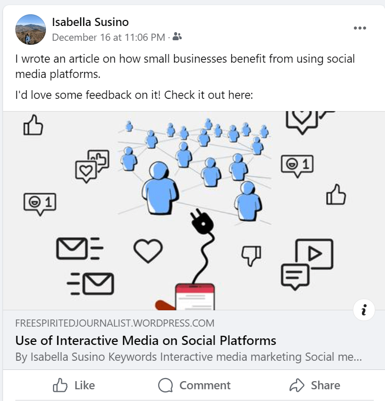 I use my Facebook page to connect with friends and family. The post advertising my article is meant to be short and sweet, with a sense of pride. I also put the prompt for feedback as a way to interact with my friends/family on a deeper level and to get their honest feedback about it. I feel that they will be more direct with me about it than someone I do not know well.