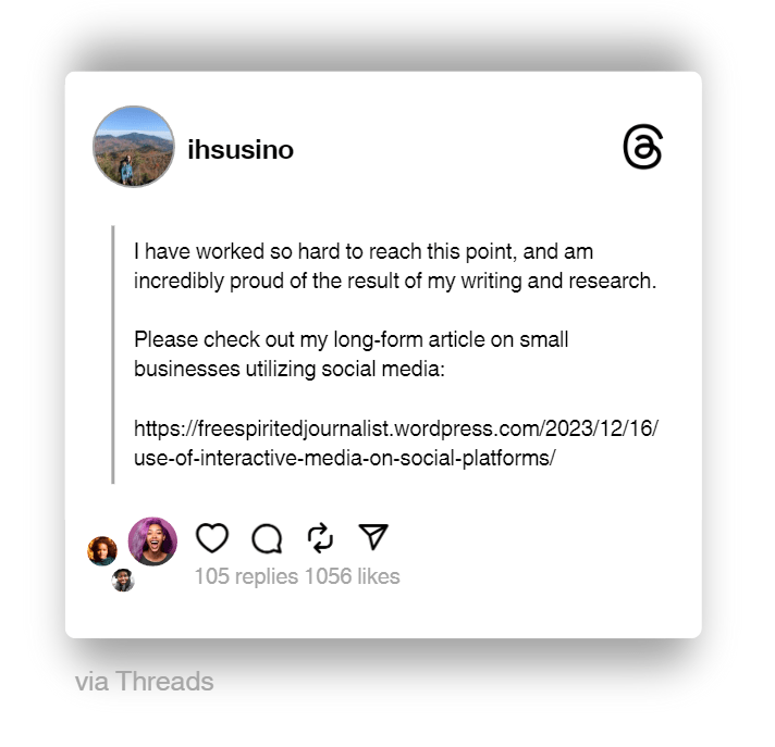 For context of this post, I have used “Twitter” but never really enjoyed it. Since the competitor is now Threads (created by Instagram/Facebook), and is a similar platform, I don’t feel the desire to create an account to just delete it. However, I did find this template on Canva and decided to use that instead. I have seen examples of Threads posts on Instagram, so I know the formatting of it. I imagine that if I was the type of person to use Threads, it would be for close friends to update them on my life and little moments that have brought joy. In that case, I would want to share my feelings in the open and be proud of myself for this accomplishment.