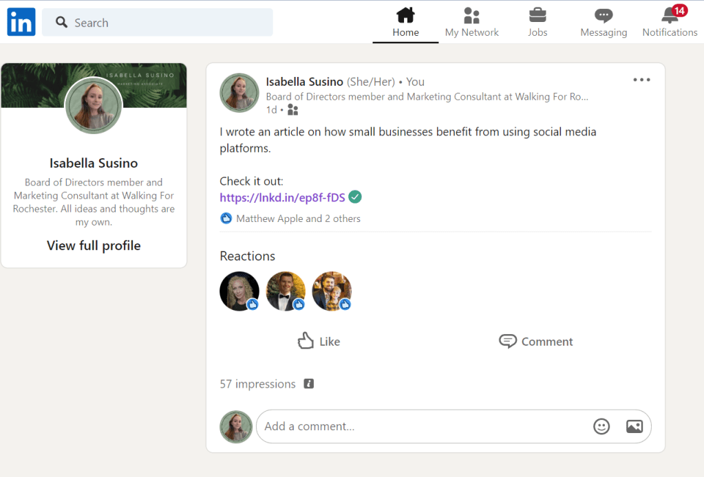 Overall, I am disappointed with how this post turned out. It was unexpected that LinkedIn created its own shorter URL, and disappointing that it didn’t include the graphic I made for the article in the post. It’s boring and uneffective in this format.