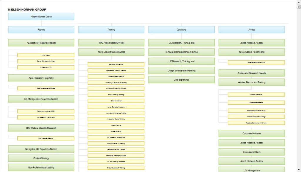 Think about the blueprint example again – this is where this comes into play in IA. In the site map below, think of each blue box as a room. The green boxes are activities you can do in that room, and the yellow boxes are the different aspects of each activity you can do.