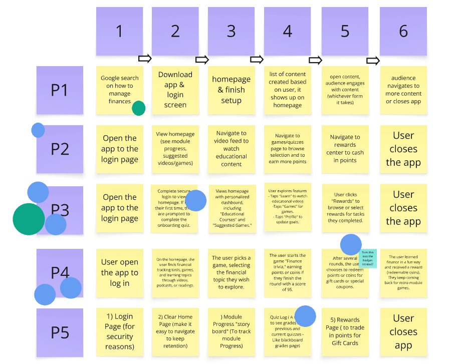 Each team member is then given two dots, and the decider gets a different color set. One dot is meant for the row that best represents the best flow to try for the final prototype, and the other is for a specific step or something important to keep in mind.