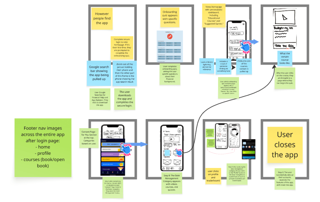 After the user flows are selected, it’s time to place the sticky notes into an 8 section storyboard. Yes, there are only 6 stickies in the user flow section, but this is when your team would fill in the missing pieces. That may look like an action step expanding into a multi-step process and the extra space will accomodate for that.