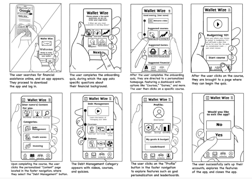 Storyboarding is the next step in a Google Design Sprint after the final sketches are done. What is a storyboard? It’s a visualization of the steps a user takes while using your product. These steps and what the app screen looks like are all derrived from the different ideation sessions, whether lightning demos or the sketches. Storyboarding gives you a clear direction for your next step: prototyping.