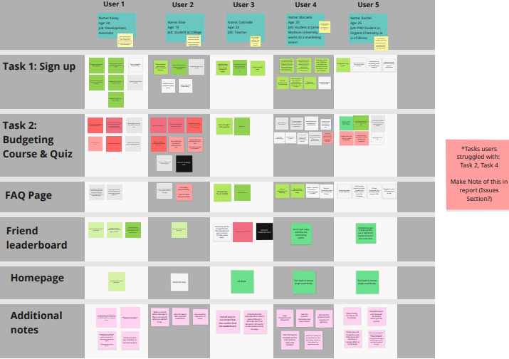 We then had to have the participant share their screen with the prototype presentation using Figma. The interviewer would follow the script while the other group members were timing each prompt, or writing sticky notes down on our Miro board.
