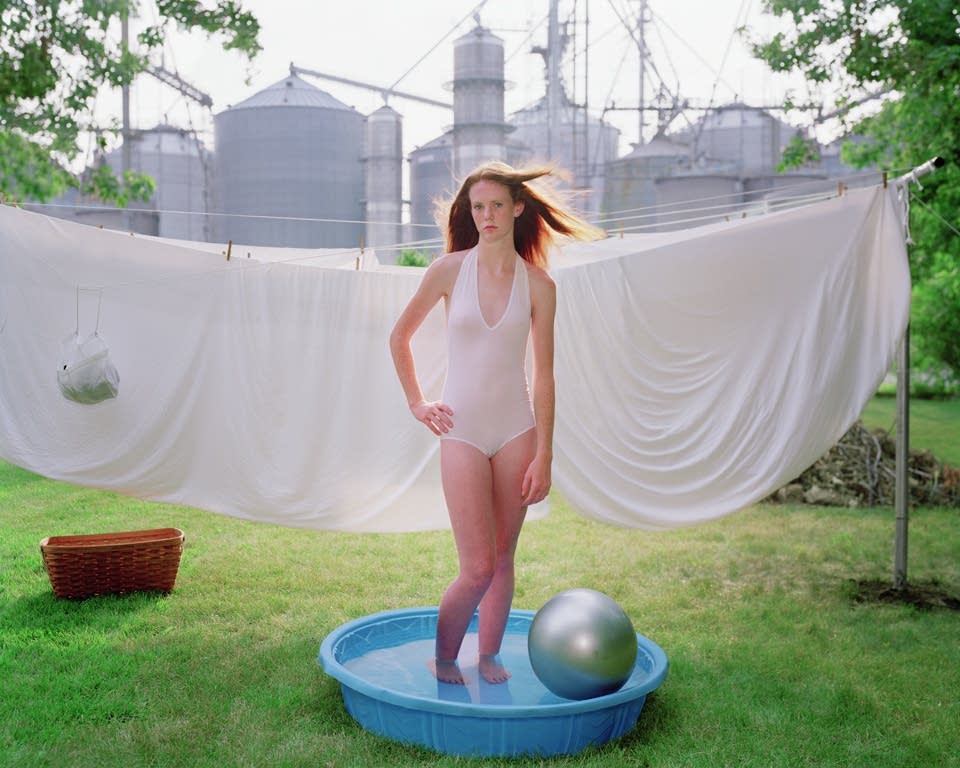 This photograph was staged to imitate Birth of Venus by Sandro Botticelli. With the young girl’s innocence paired with the hanging sheets, inflatable pool, and what appears to be a diaper above the basket, it’s foreboding image. Motherhood shown in this way with the white swimsuit and sheets can almost be seen as pure. What’s hiding in the image is the unseen work of mothers.